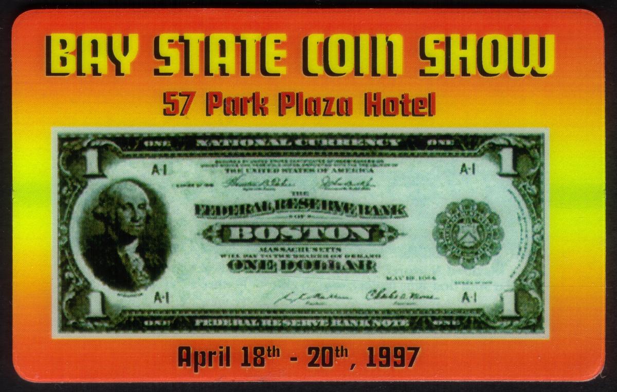 Overall, this card serves both as a collectible souvenir and a tangible connection to the April 1997 Bay State Coin Show held at the Park Plaza Hotel in Boston. It ties together key themes of currency, coin shows, and numismatics and fulfills a specific role for collectors affiliated with these interests.
