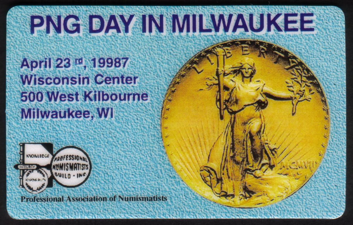 This collectible card features the design of a $20 St. Gaudens Gold Coin themed phone card issued by Tell-One Inc. The card is marked with “5m PNG Day In Milwaukee Wisconsin (04/98),” referencing a collectible event or theme tied to Milwaukee, Wisconsin in April 1998. The front of the card includes the text “St. Gaudens Gold Coin,” identifying the famous U.S. gold coin designed by Augustus Saint-Gaudens.