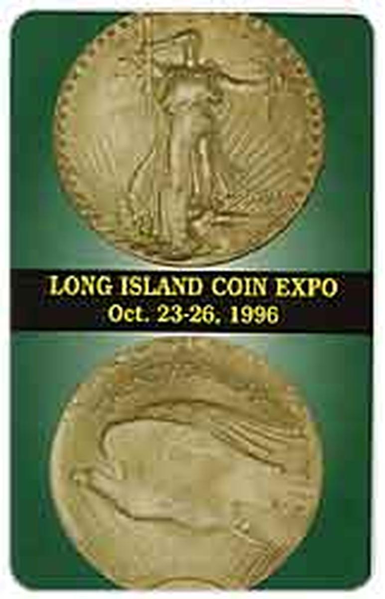 The card includes text identifying key numismatic terms such as "Standing Liberty" and references to collectible coins, numismatics, and currency. The design also cites the 5 million Long Island Coin Expo in October 1996, emphasizing its connection to coin shows and collectors. "1933 $20 Gold St. Gaudens Coin" is also mentioned on the card, connecting it to notable gold coins and the historic St. Gaudens design.