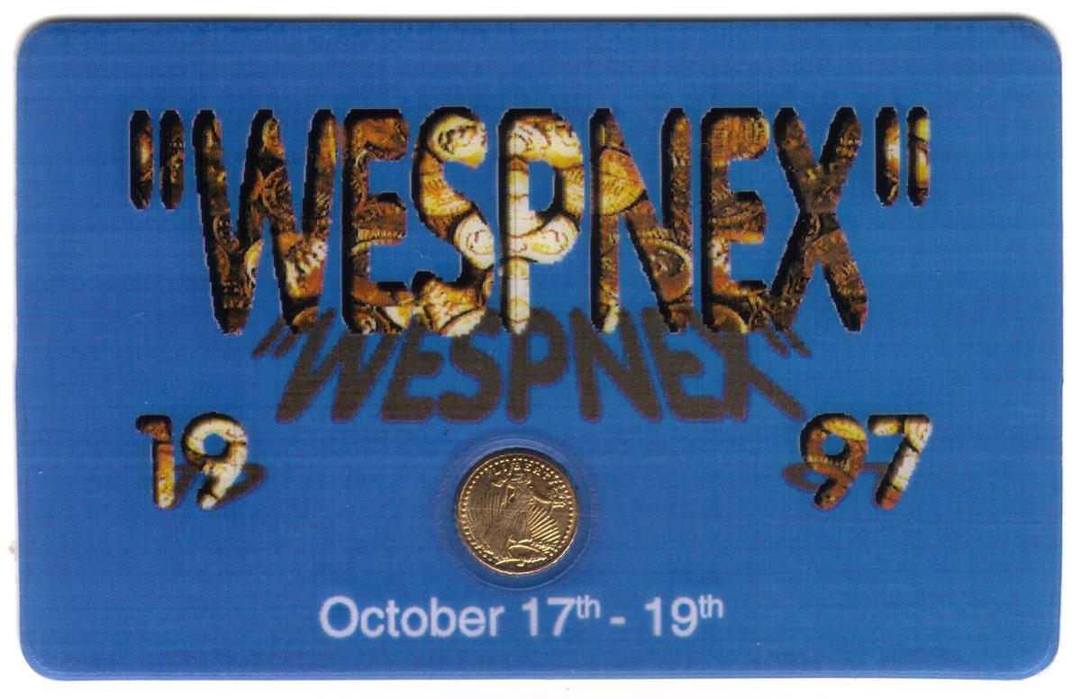 This collectible chip card from the Westchester County New York 5m WESPNEX Coin Show (October 1997) features a small embedded $20 gold coin replica produced by Tell-One Inc. The front of the card prominently displays the gold coin replica, which is a detailed representation of U.S. coinage. The coin is embedded slightly above center on the card, showcasing its shiny gold surface and realistic coin design.