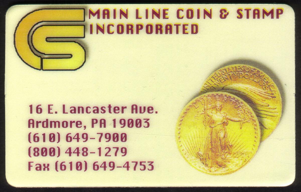 The card also bears the name "5m Main Line Coin & Stamp Inc." located in Pennsylvania, identifying the issuer or associated dealer of this collectible item. This connection highlights the card’s relevance to collectors interested in gold coins and numismatic history, particularly those focusing on rare and valuable U.S. currency. The text and layout of the card focus on the coin’s value and historical context without excessive decoration, maintaining a professional and catalog-style appearance.