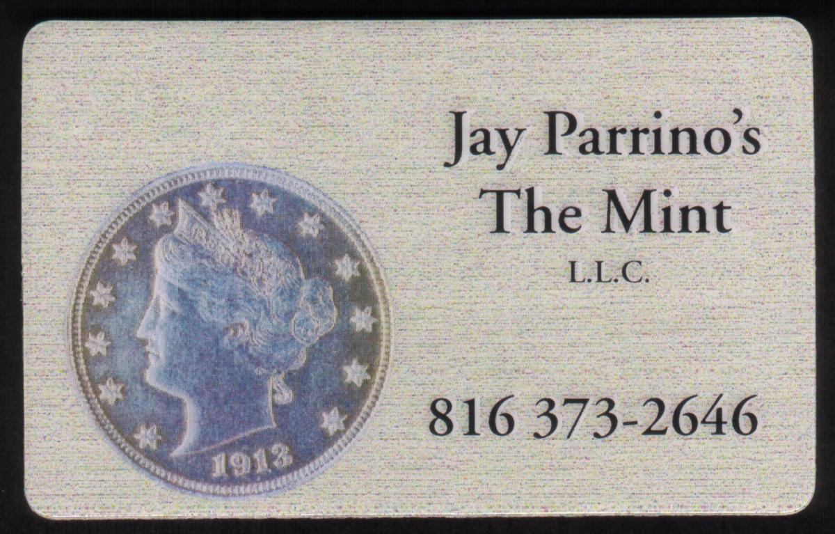 The card is issued by Jay Parrino's The Mint L.L.C., with the business name clearly printed in black text in the upper right area of the card. Below the company name is a contact phone number: 816 373-2646. The background of the card has a subtle textured pattern that adds depth to its overall appearance.