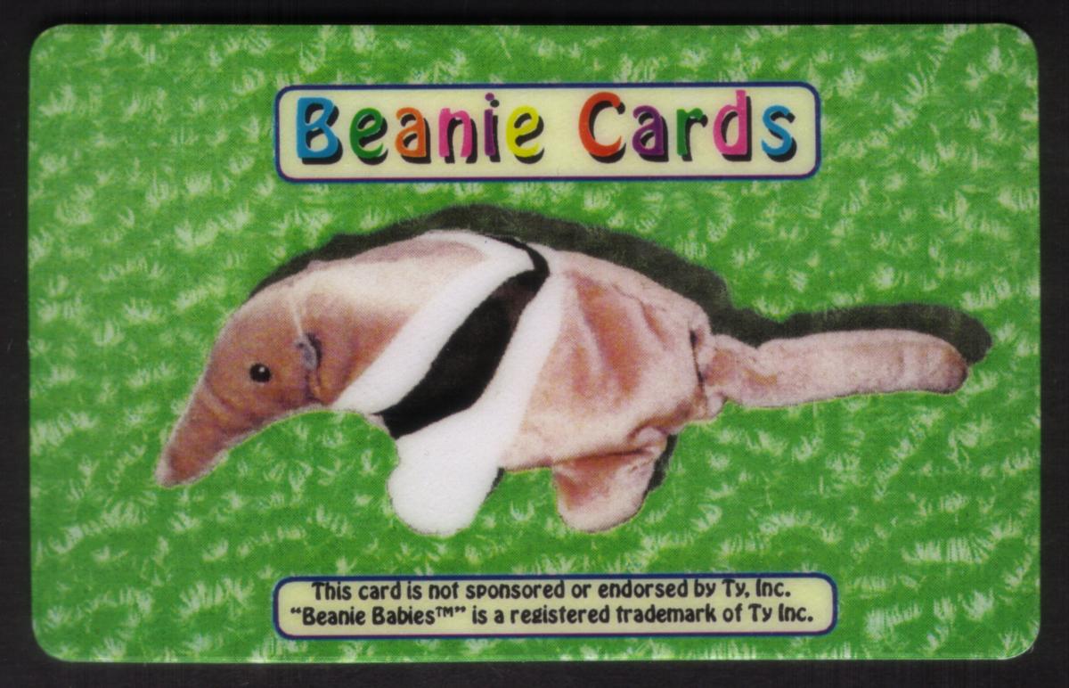 Below the image of Ants the Anteater, there is a disclaimer in a small white box with black text stating: "This card is not sponsored or endorsed by Ty, Inc. 'Beanie Babies™' is a registered trademark of Ty Inc." This confirms the official trademark status of Beanie Babies while clarifying the card’s independent status.