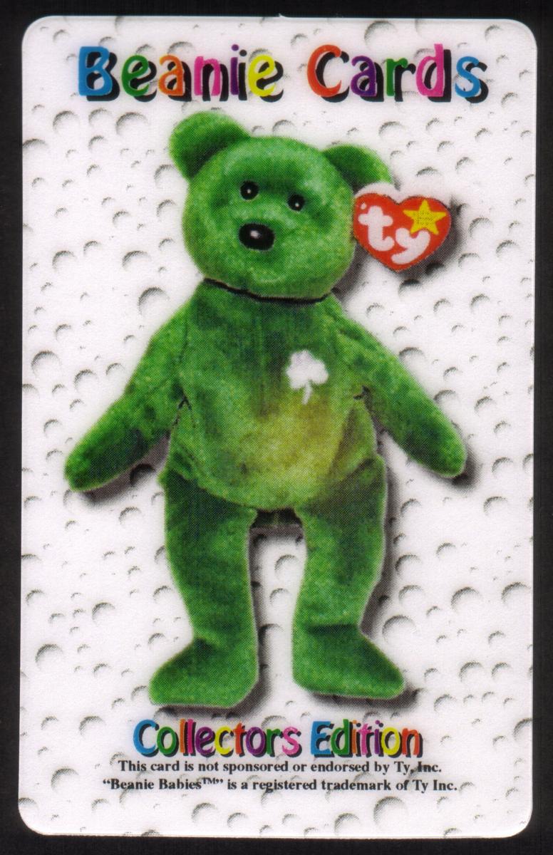 This collectible Ty Beanie Babies card features Green Erin, the Irish bear, as the central figure. Green Erin is depicted as a teddy bear with a clover detail on its chest, representing Irish heritage. The bear is a part of the collector's edition series and is associated with Ireland, emphasizing its green color and the shamrock symbol that traditionally signifies luck and Irish culture.