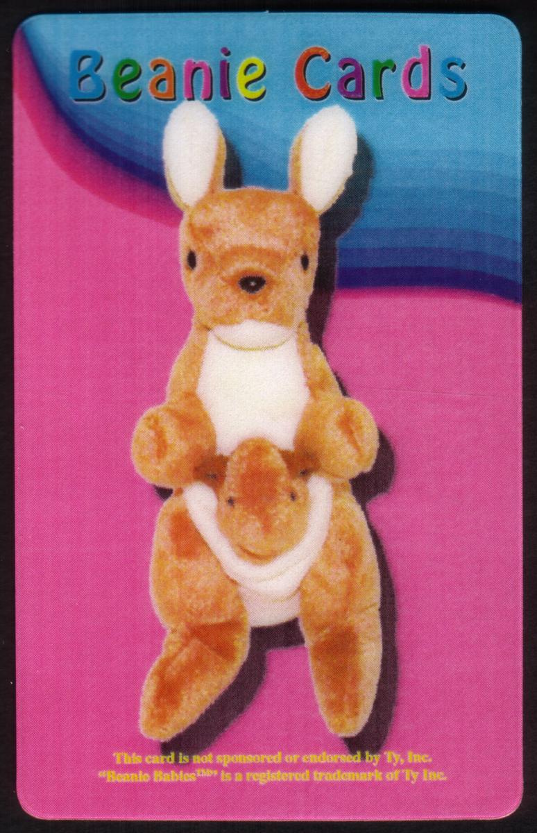 The card’s design emphasizes the adorable kangaroo figure with soft textures visibly highlighted, while the background gradient creates a contrast that draws attention to the Beanie Baby image and colorful title.