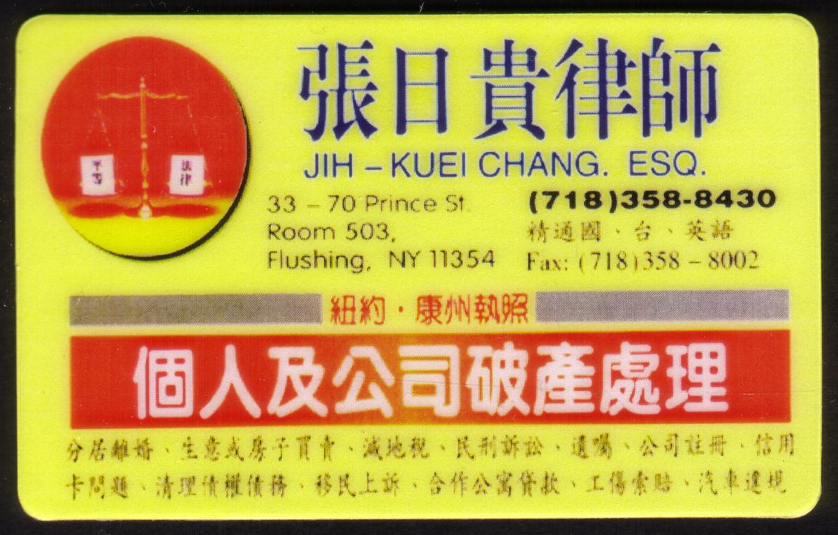 This collectible promotional card features the name Jih-Kuei Chang, Esq., Attorney At Law, prominently displayed and located at 33 - 70 Prince Street, Flushing, New York. The card is associated with legal services, highlighting attorneys, business cards, law firms, legal counsel, and lawyers. Chinese writing appears on the card, indicating an aspect of cultural or linguistic relevance.