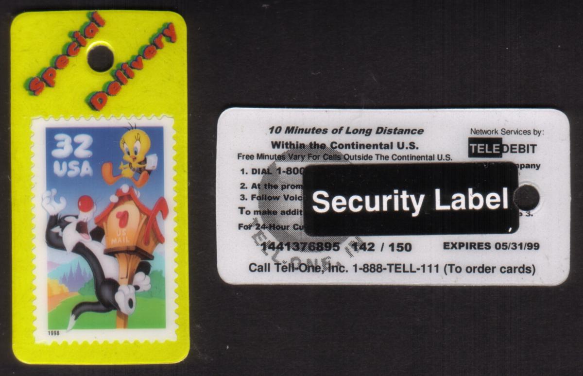 The card doubles as a small keychain, making it a functional collectible. It includes reference to a “5m Sylvester & Tweety On 32 Cent USA Postage Stamp,” indicating a thematic link to mail and postage. The image incorporates mailbox and letter elements, reinforcing the special delivery and philatelic theme. This connection places the card within the niche of stamp collecting and mail-related collectibles.