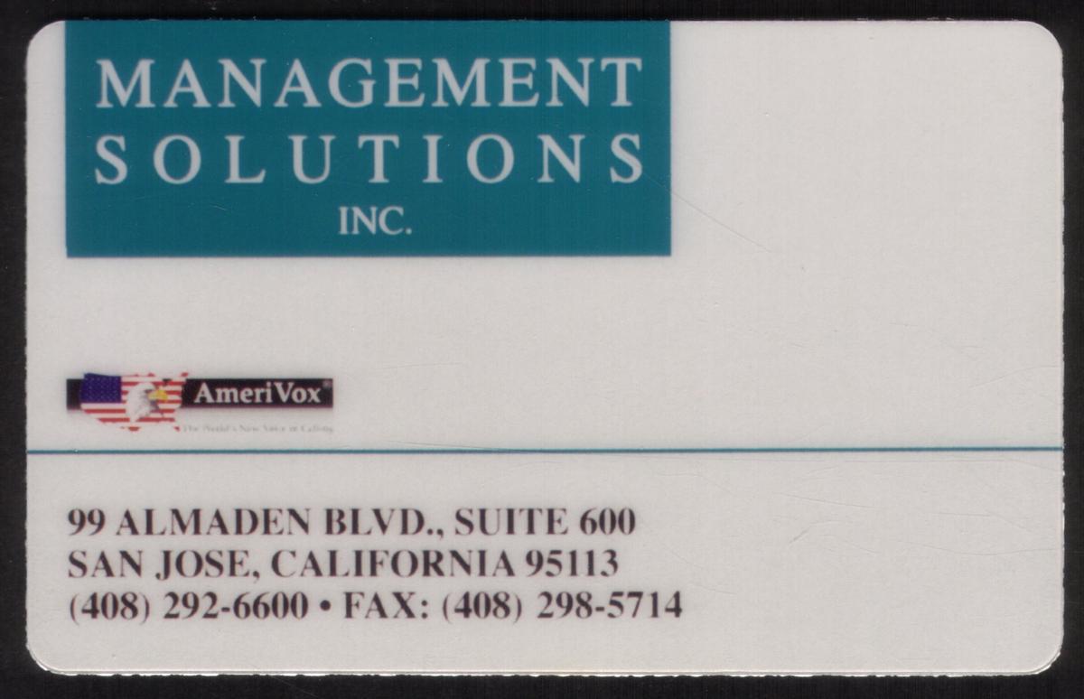 The card’s visual arrangement centers on the text and logo elements without the presence of photographic imagery or additional artwork. The colors, fonts, and layout reflect a formal business-oriented theme suited for promotional or identification use by Management Solutions, Inc.