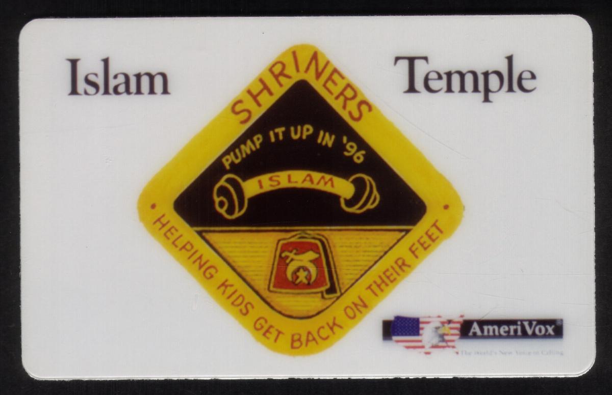 Additional keywords include logos, trademarks, Muslim, religion, weightlifting, and barbells, which relates to the visual elements present. No numbers or helmet markings appear on this card. The card represents a collectible item connected to the Shriners organization and their charitable efforts, with clear branding and a focus on the Islam Temple.