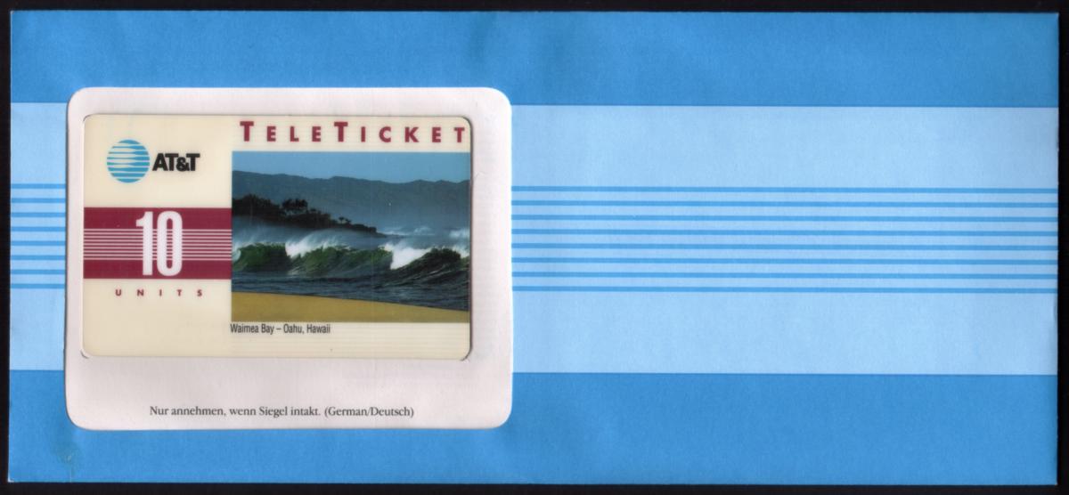 This collectible AT&T Teleticket phone card features a scenic nature photograph of Waimea Bay on the island of Oahu, Hawaii. The image prominently displays powerful ocean waves breaking toward a golden sandy beach. In the background, a range of lush, green mountains under a clear blue sky complements the coastal scene. The photograph captures the dynamic movement of the water with white surf and foam visibly cresting the waves.