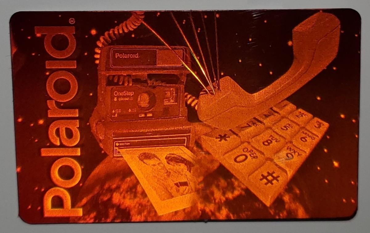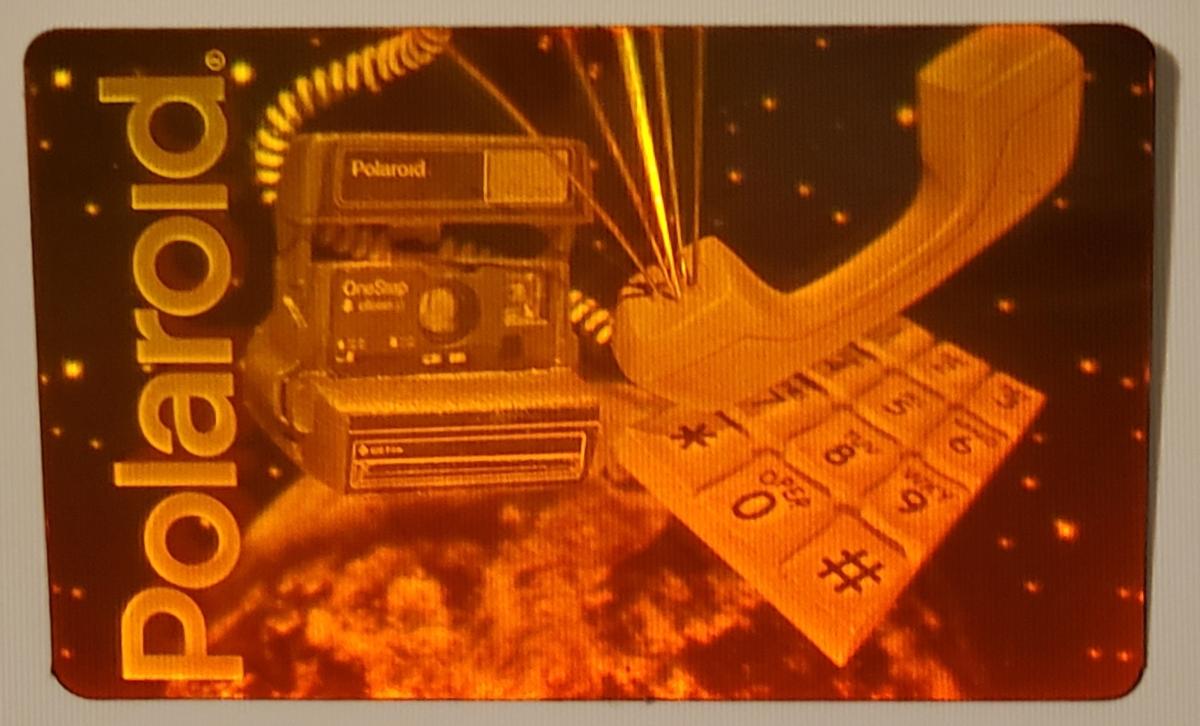 This collectible phone card features a predominantly greenish design with a Polaroid hologram prominently displayed. The hologram includes images of a Polaroid camera and a telephone handset, emphasizing the theme of phones on phonecards. The card is issued by GTI Telecom, Inc. and highlights the connection between communication devices and collectible phone cards.
