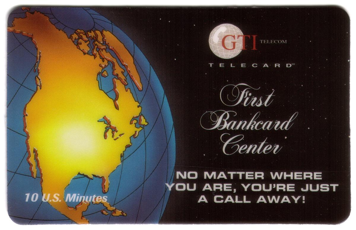 This collectible bank card features the First Bankcard Center promotional design. The card prominently displays the phrase, "...You're Just A Call Away," emphasizing a customer service message. In the bottom right corner, the word "SAMPLE" is clearly printed. The card is issued by GTI Telecom, Inc., as indicated by the branding below the slogan.