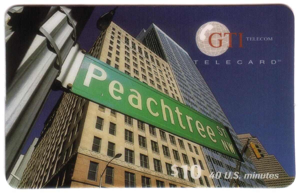 This item is a collectible phone card intended for telecommunications use. The detailed image of Peachtree Street and the building reflects an urban setting, connecting the card visually to a recognizable location. The clear and precise text elements make it easy to identify the card’s value and originating company.