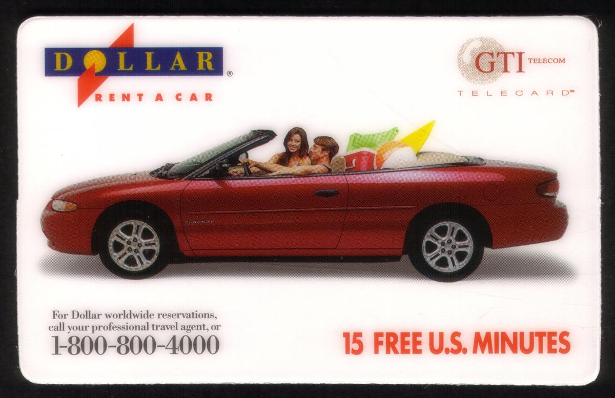 In the upper right corner of the card, the text reads “Dollar Rent-A-Car,” indicating the promotional nature linked to the Dollar Rent-A-Car brand. Below that, “15m” is printed, referring to the card’s value or usage time. The bottom right corner features the logo and name “GTI Telecom, Inc.,” the telecommunications provider associated with the card. The layout balances the promotional elements with the automotive imagery, combining logos, trademarks, and text efficiently.