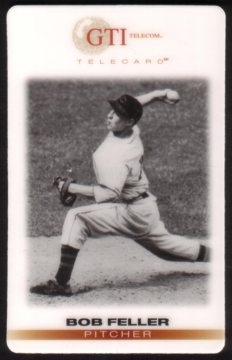 Overall, the card pays tribute to Bob Feller’s baseball career with a sharp, classic black-and-white presentation, emphasizing his role as a baseball pitcher and legend within the sport. The layout combines sports imagery with collectible phone card functionality, making it a valued item for both baseball enthusiasts and card collectors.