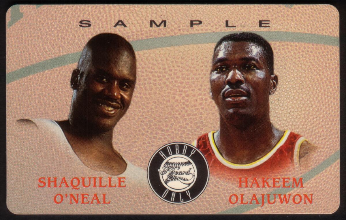 This collectible card holds significance for basketball fans and collectors focused on NBA history and MVP players. The text on the card clearly names Shaquille O’Neal and Hakeem Olajuwon, making it a focused tribute to their achievements during their careers in professional basketball.
