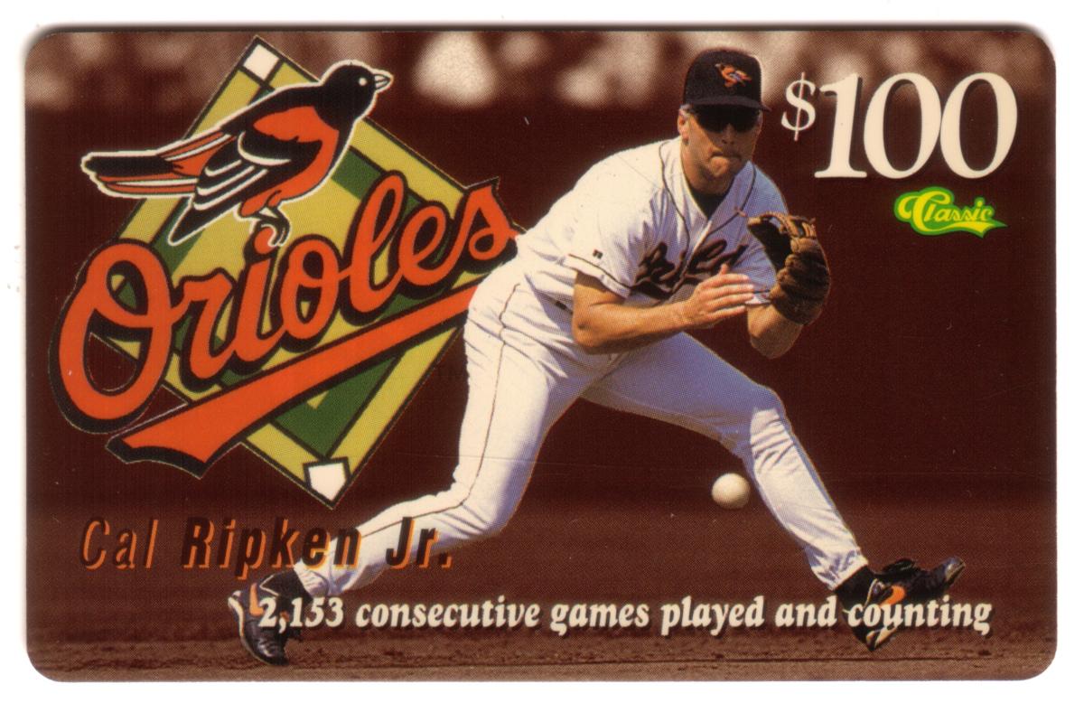 The top right corner of the card displays a denomination of $100 in white text, and below that, the "Classic" logo appears in green. The upper left corner prominently features the Baltimore Orioles team logo, with a stylized oriole bird perched above the word "Orioles" written in bold script over a baseball diamond graphic.
