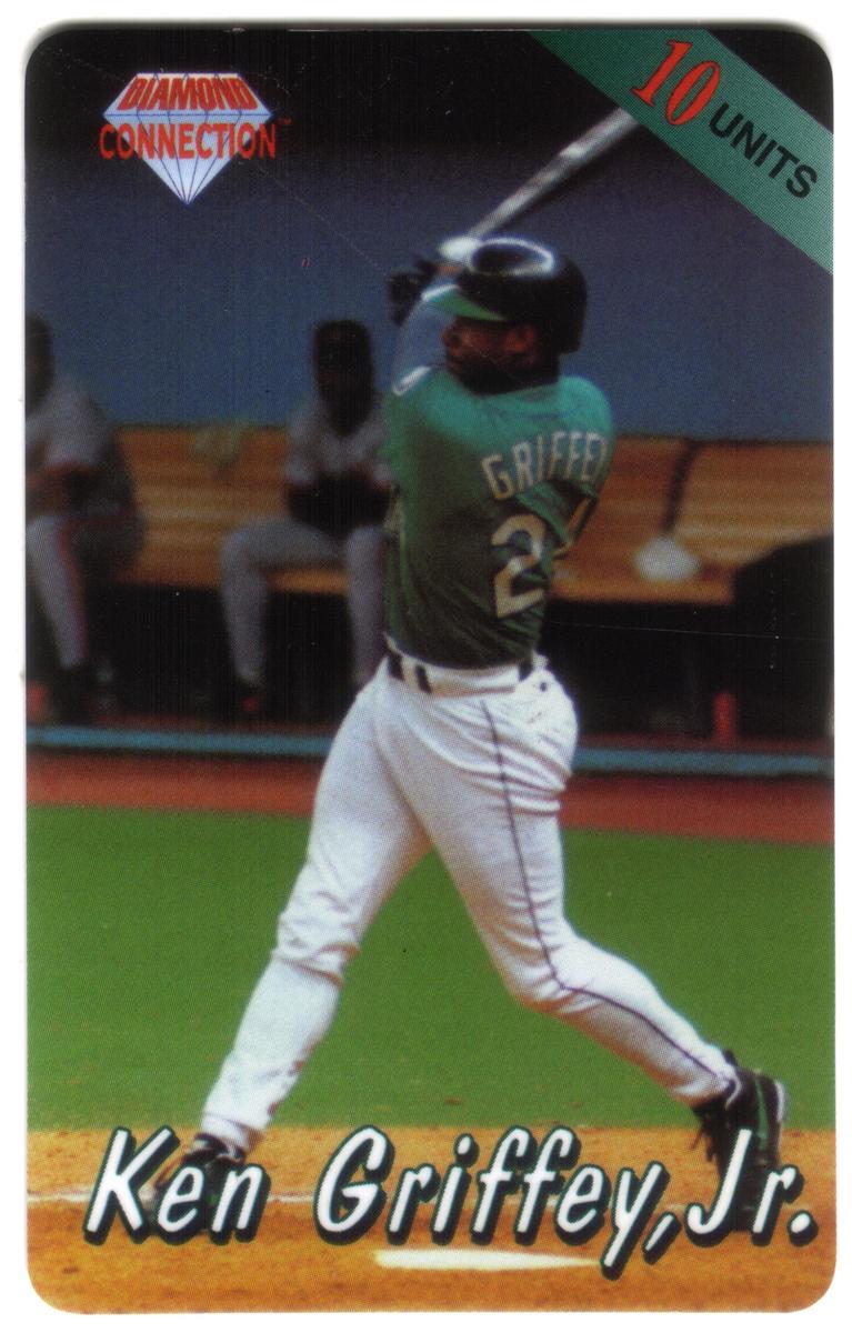 This collectible phone card features a photographic image of Ken Griffey Jr., a renowned Major League Baseball player, captured mid-swing while wearing a green shirt. The card is issued by Diamond Connection MCI and has a denomination of 10 units. The image emphasizes Griffey’s batting stance, showcasing his focus and form during the game. The background includes a baseball diamond motif with American flags, highlighting the Americana theme and Major League Baseball heritage.