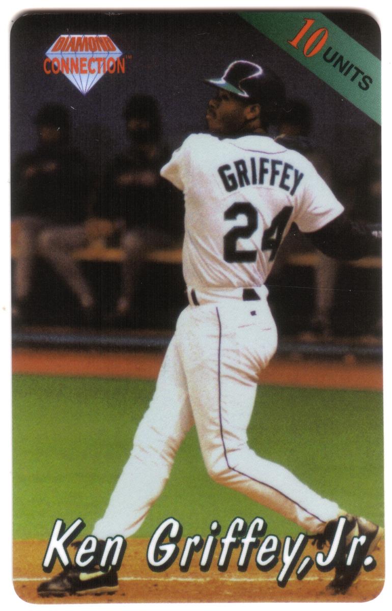 Overall, this card serves as a tribute to Ken Griffey, Jr.’s legacy in American baseball and the Cincinnati Reds, combining sports imagery with American flag elements. It is a licensed Diamond Connection phone card issued by MCI, celebrating Griffey’s skill and importance as an MVP in Major League Baseball.