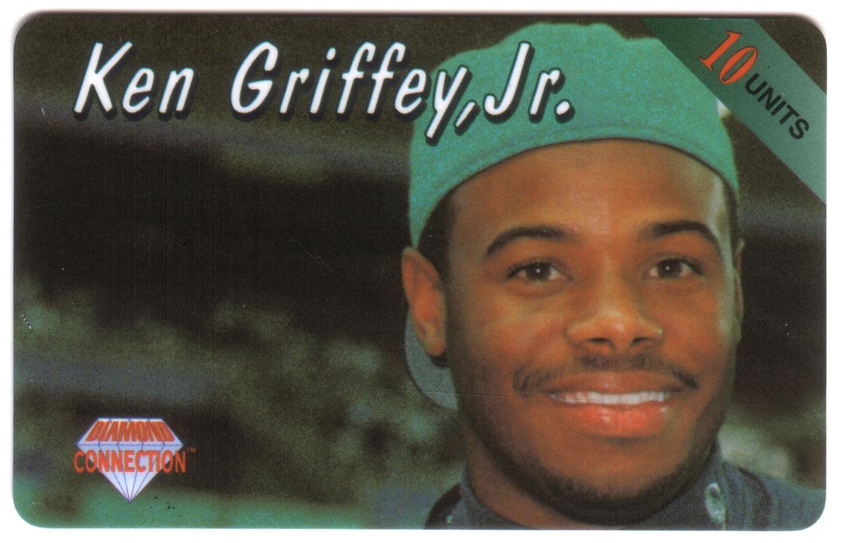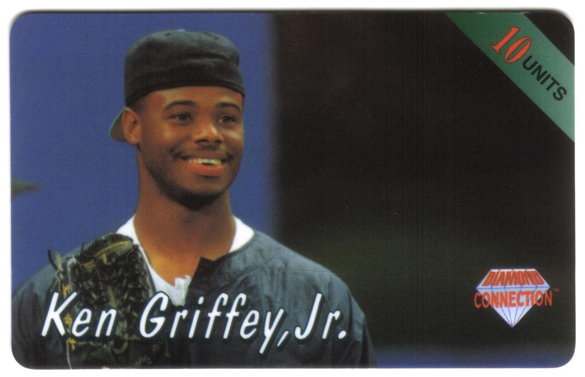 Each of these Diamond Connection telephone cards is marked with "10 UNITS" in the top right corner, indicating their calling value. The "Diamond Connection" logo appears prominently on each card. The series highlights Ken Griffey, Jr.'s contributions to baseball and is part of a matched set of five cards produced by Diamond Connection and distributed by MCI. These cards reflect Americana and baseball culture, celebrating one of MLB's greatest stars.
