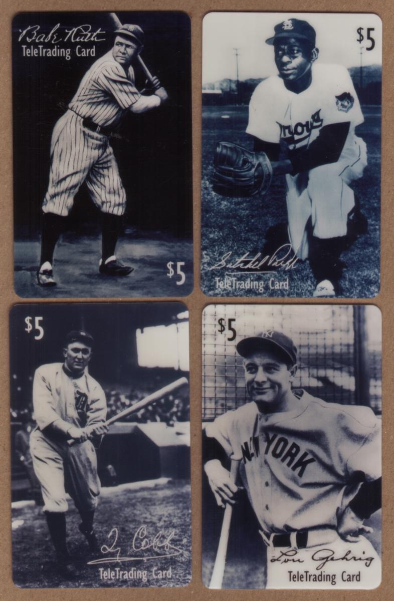 This set of four TeleTrading Cards features black and white photographic images of legendary baseball players, highlighting their iconic presence in the sport. Each card is marked with a $5 denomination and includes the player’s printed signature along with the "TeleTrading Card" text. The players featured in this set are Babe Ruth, Lou Gehrig, Satchell Paige, and Ty Cobb.