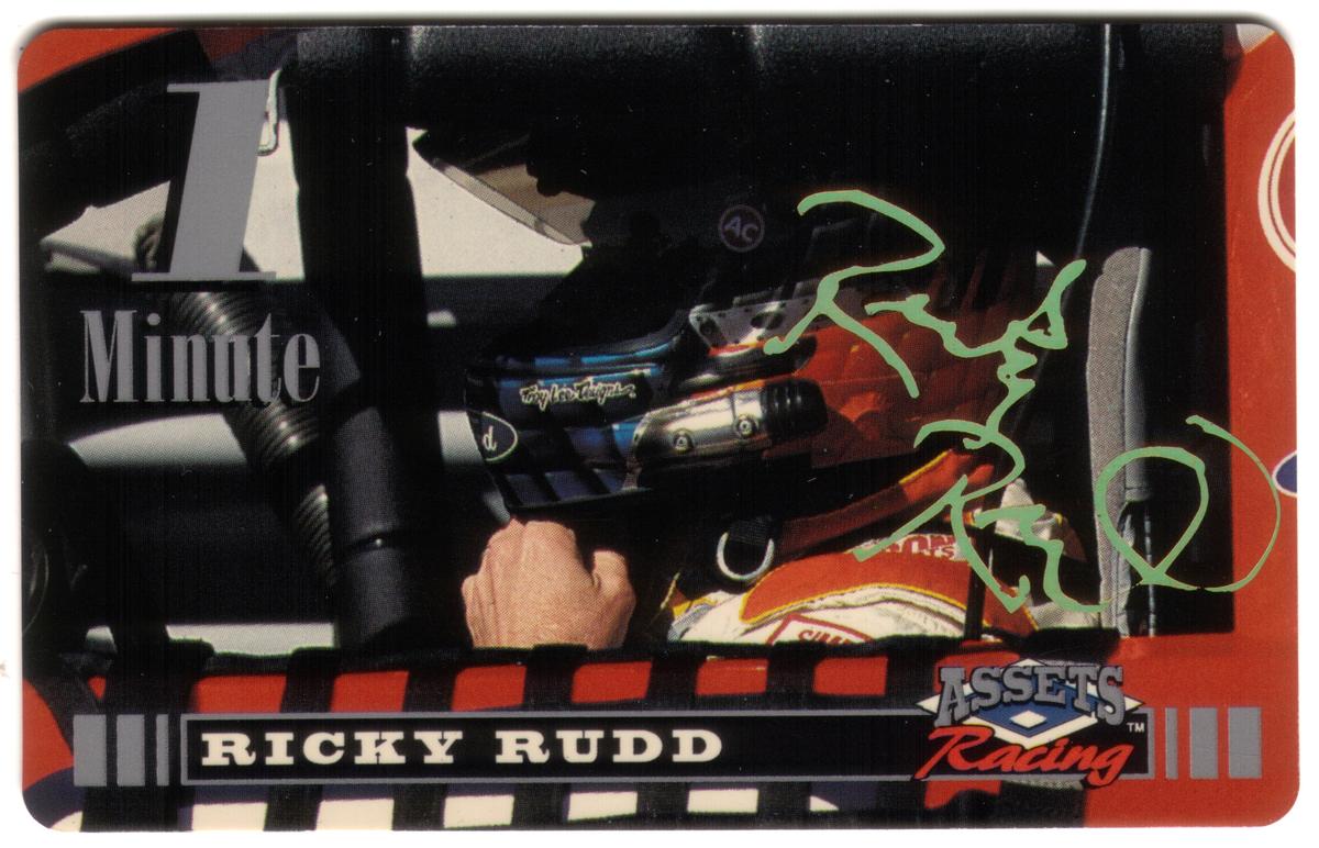 The car shown on the card is representative of NASCAR racing vehicles from the mid-1990s, underlining the era to which this collectible belongs. The text includes “1 Minute Ricky Rudd SIGNED,” reinforcing the card’s authenticity within the Assets Racing 1995 series. The overall design integrates both the racing helmet and a portion of the race vehicle, combining to honor the driver’s achievements and legacy in NASCAR.