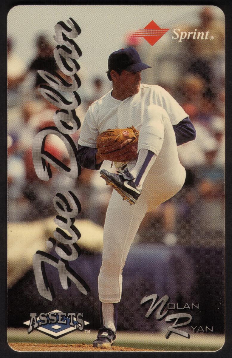 The card has the word "Five Dollar" written prominently in large, black script on the left side, indicating its value. Nolan Ryan’s name is displayed at the bottom right corner in stylized silver text: "Nolan Ryan," with the initials "N" and "R" enlarged and linked together. The top right corner shows the Sprint logo in red and white. At the bottom left corner, the card bears the "ASSETS" series logo with the word "ASSETS" and a diamond-shaped design beneath it, indicating its series and branding.