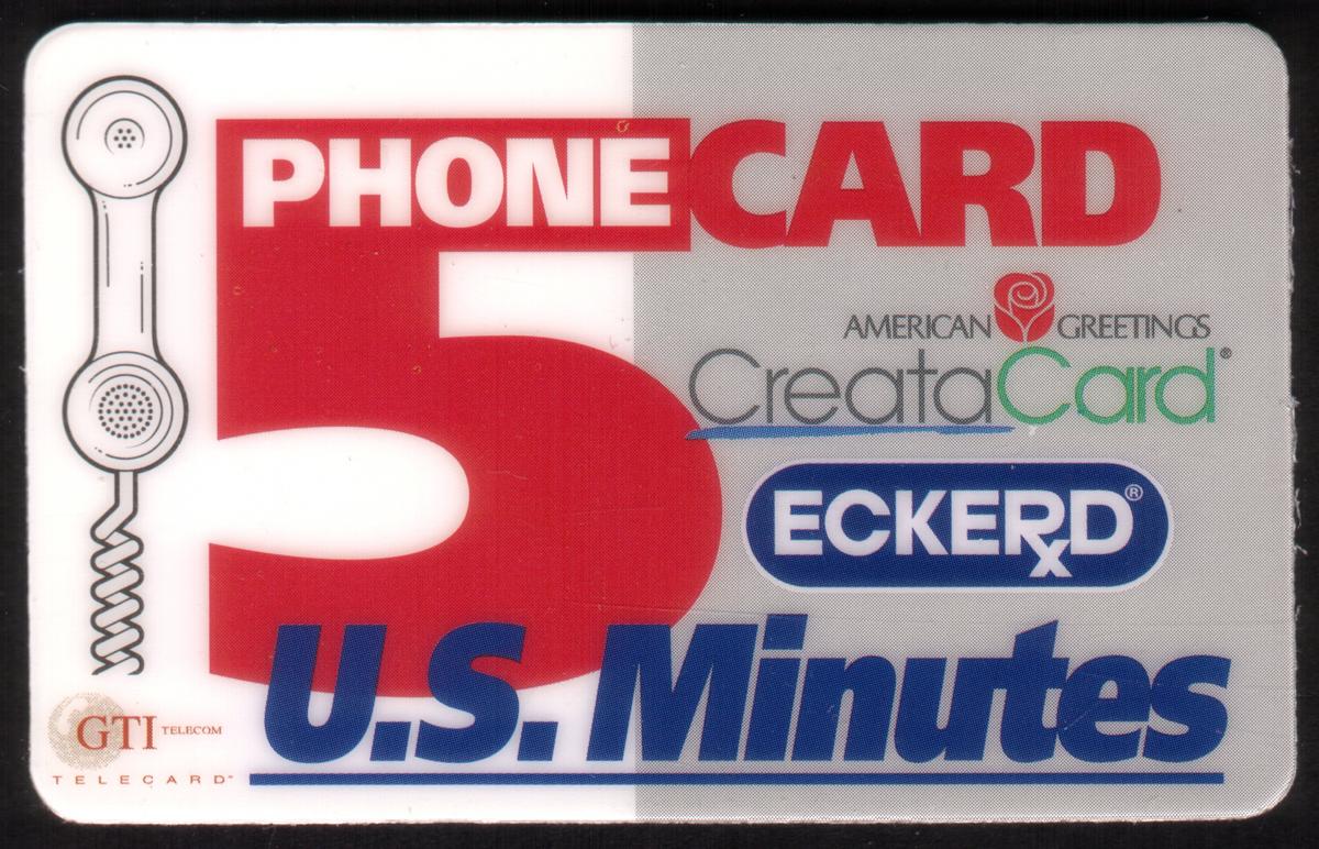 This collectible phone card is part of GTI Telecom, Inc.’s promotional series, designed for use at Eckerd stores. Its prominent branding highlights the partnership between American Greetings and GTI Telecom, Inc., representing a unique collaboration intended for telephone users who also enjoy greetings and celebratory messaging. The card’s layout is clean, with clear typography that enhances readability and branding visibility.