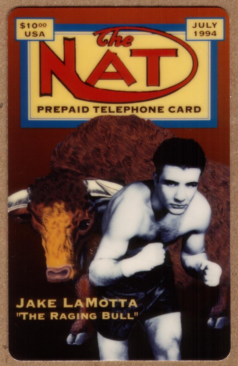 The card associates with the sport of boxing and professional fights, celebrating Jake LaMotta's influence in the sport. The front includes essential branding without additional symbols or text beyond what identifies the denomination, the athlete, and the telephone company issuer.