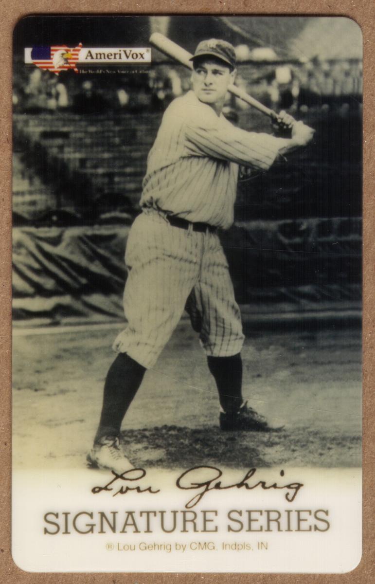 At the top left corner of the card is the AmeriVox logo, which includes an American flag design integrated with the text. Below the photograph, the card is labeled as "Lou Gehrig SIGNATURE SERIES" in stylized text. Beneath this, it states "© Lou Gehrig by CMG, Indpls, IN," indicating the copyright holder and location connected to the production of this collectible.