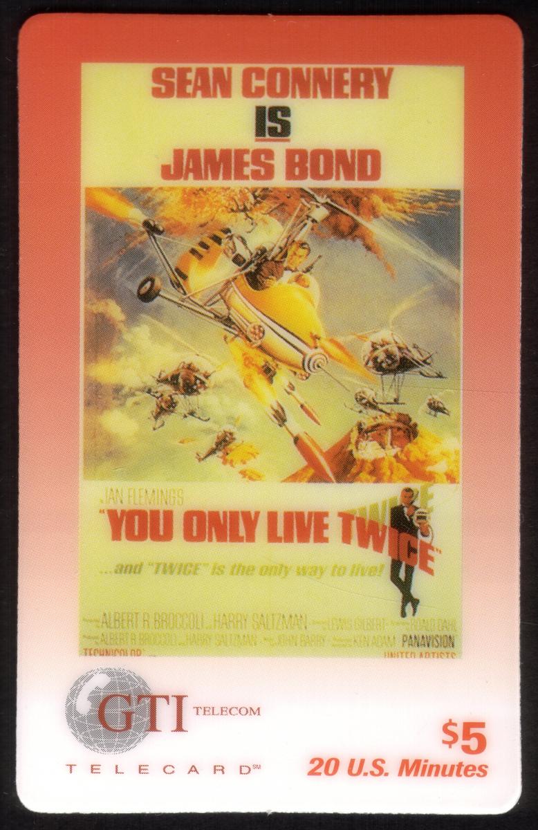 This collectible phone card features a James Bond 007 movie poster for the film "You Only Live Twice." The image prominently displays Sean Connery, who famously portrayed James Bond. The design includes the iconic 007 logo with the gun incorporated into the number seven, emphasizing the spy theme associated with Ian Fleming’s character. The card prominently shows the $5 denomination and is issued by GTI Telecom, Inc.
