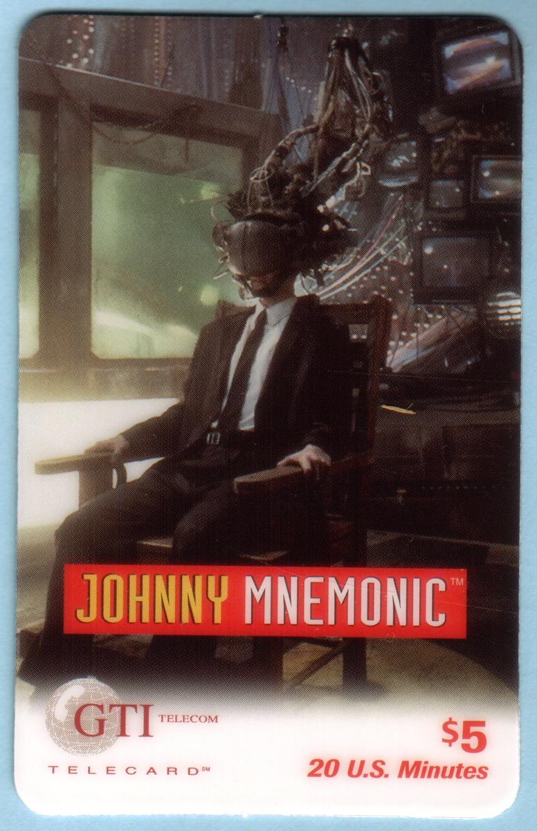 This collectible phone card features an image related to the 1995 science fiction film *Johnny Mnemonic*. The front of the card prominently displays a color photograph of Johnny, portrayed by Keanu Reeves, seated in a futuristic chair. The visual style is distinctly wired and futuristic, reflecting the movie’s cyberpunk aesthetic. The photograph captures Johnny in a moment from the film, emphasizing the character’s connection to technology and data storage.