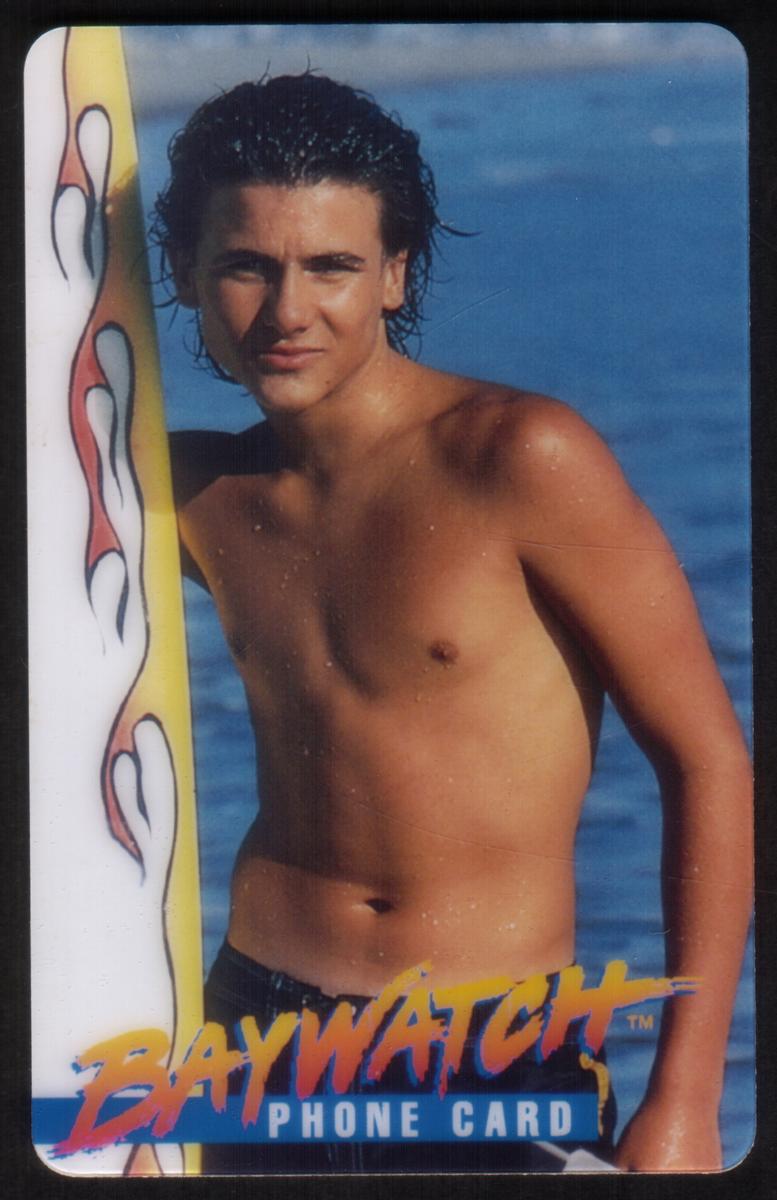 This collectible chip card features a male actor from the television show Baywatch. The actor is shirtless and posed with a surfboard, embodying the iconic beach and lifeguard theme of the series. The image captures the actor in a relaxed stance, holding the surfboard vertically with one hand. The background reflects a bright, sunny beach atmosphere, complementing the overall sporty and dynamic vibe associated with Baywatch.