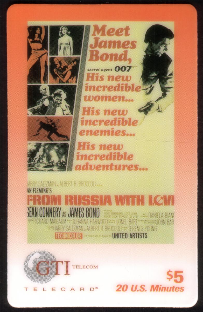 The card also includes text identifying the movie title *From Russia With Love* and highlights the $5 value printed on it. The branding for GTI Telecom, Inc. appears in the lower portion of the card, indicating the telecommunications company associated with this collectible. The card art captures the drama and style of the James Bond franchise, emphasizing Hollywood’s iconic spy character created by Ian Fleming.
