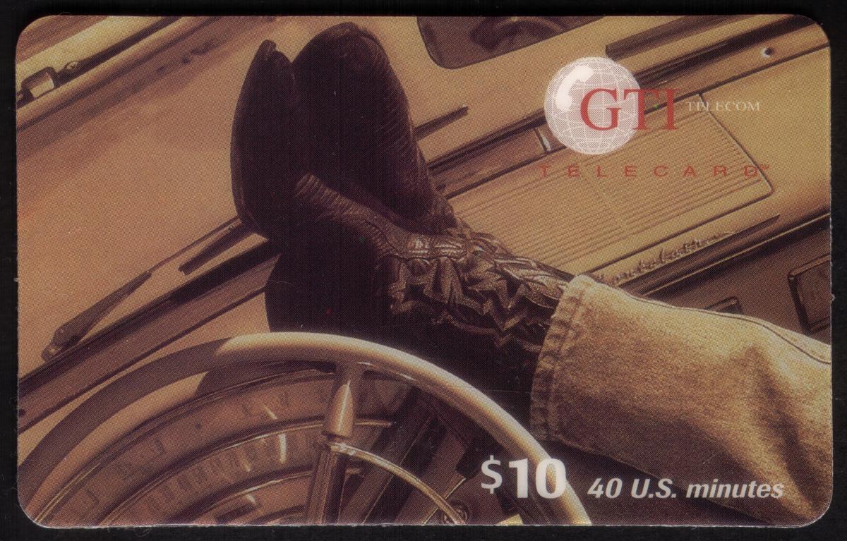 The card includes the name "GTI Telecom, Inc." printed clearly, indicating the issuing company. The visual setting incorporates warm colors suggestive of sunset lighting, adding to the mood of tranquility and leisure behind the wheel. The focus on the automobile’s interior elements alongside the cowboy boots creates a strong connection between western imagery and the automobile culture.