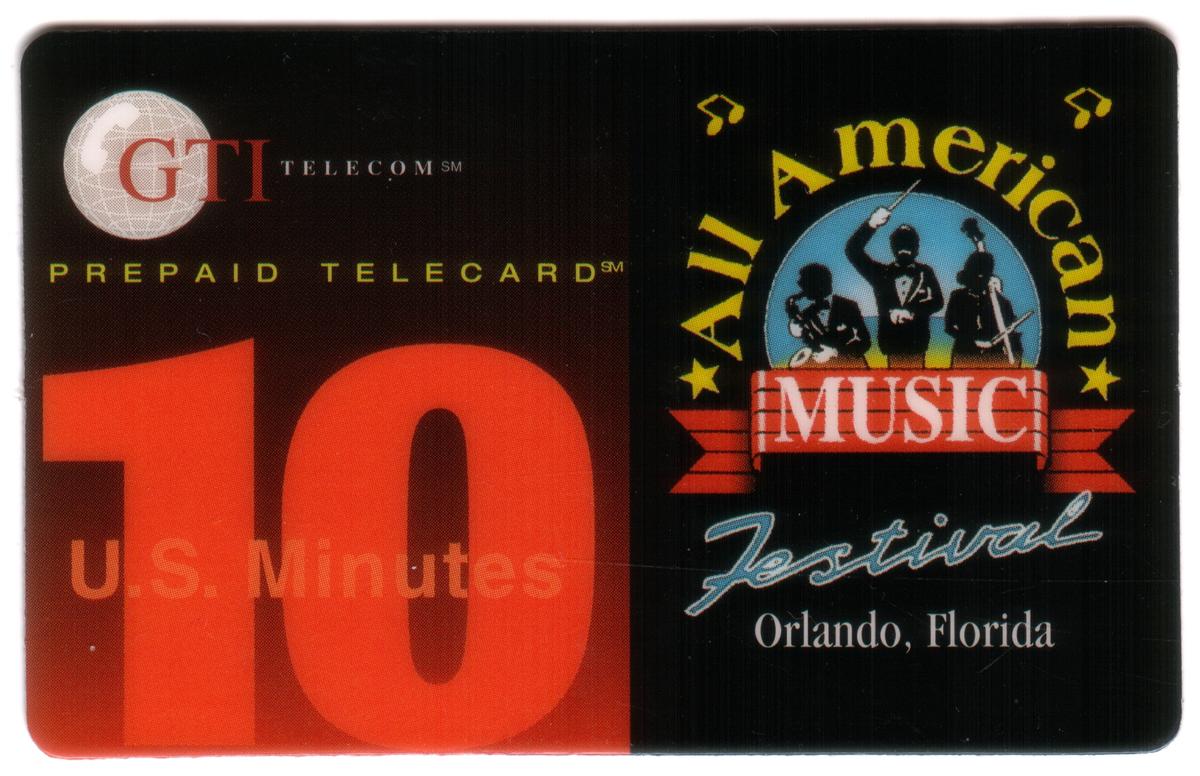 This collectible phone card features a vivid design promoting the All American Music Festival held in Orlando, Florida, in 1994. The card displays a lively musical theme with images of various musical instruments including a saxophone, a conductor's baton, a bass, and string instruments. Floating around the card are musical notes, reinforcing the strong connection to music and performance. At the center, the festival’s official logo is prominently displayed, reading "All American Music Festival," accompanied by the location and year “Orlando, Florida 1994.”