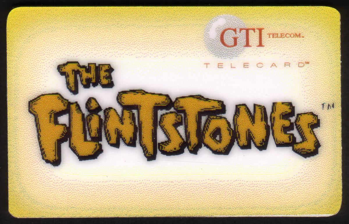 The card’s artwork emphasizes a colorful, cartoonish style consistent with "The Flintstones" TV show, highlighting its signature prehistoric theme. The background includes simple artistic elements enhancing the animation style without distracting from the characters themselves. The card also includes branding for "GTI Telecom, Inc.," indicated near the bottom right corner, identifying the company associated with this collectible phone card prototype.