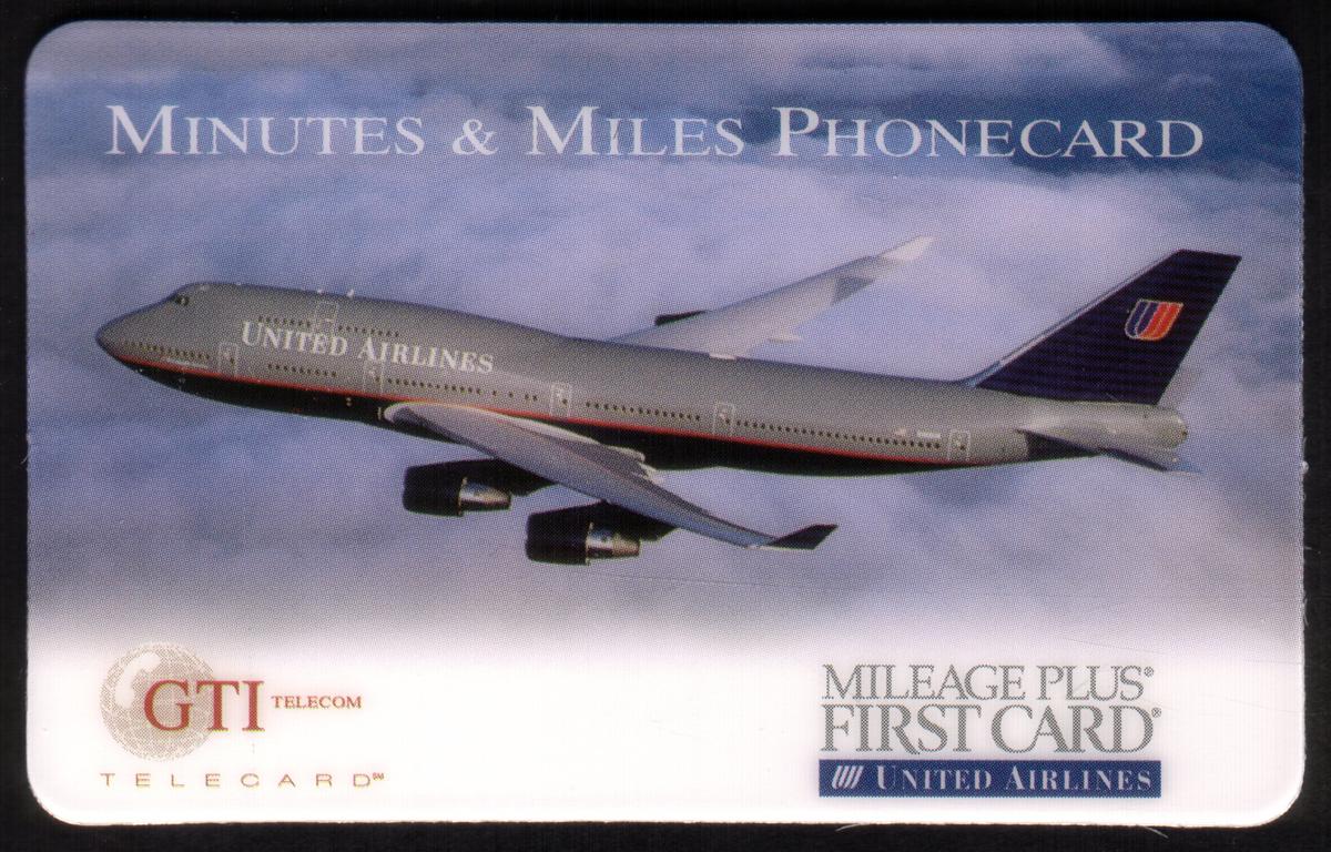 Overall, this collectible card merges the world of commercial aviation with airline mileage programs, serving as a unique collectible tied to United Airlines, GTI Telecom, and aviation enthusiasts focusing on iconic aircraft like the B-747.