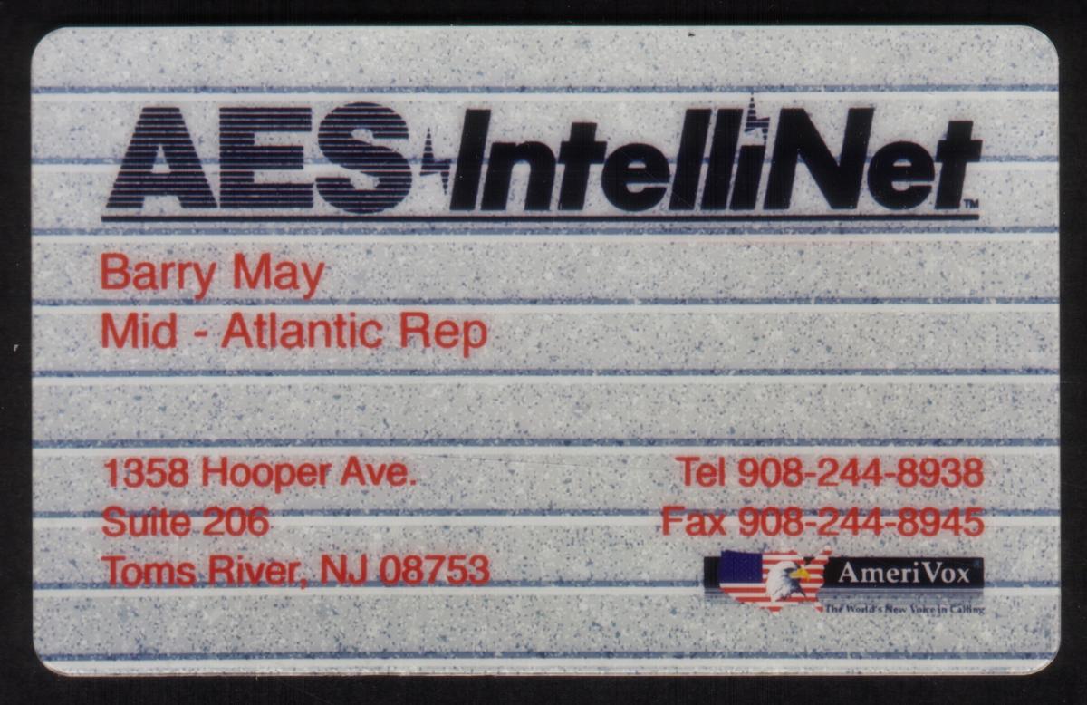 This collectible business card features the logos and trademarks of AES IntelliNet and AmeriVox prominently. The card identifies Barry May as the Mid-Atlantic Representative based in New Jersey. The text "SPECIMEN" is clearly displayed on the card, indicating its status. The background uses a clean, professional layout to present the business information, with the names and titles arranged distinctly for easy reading.