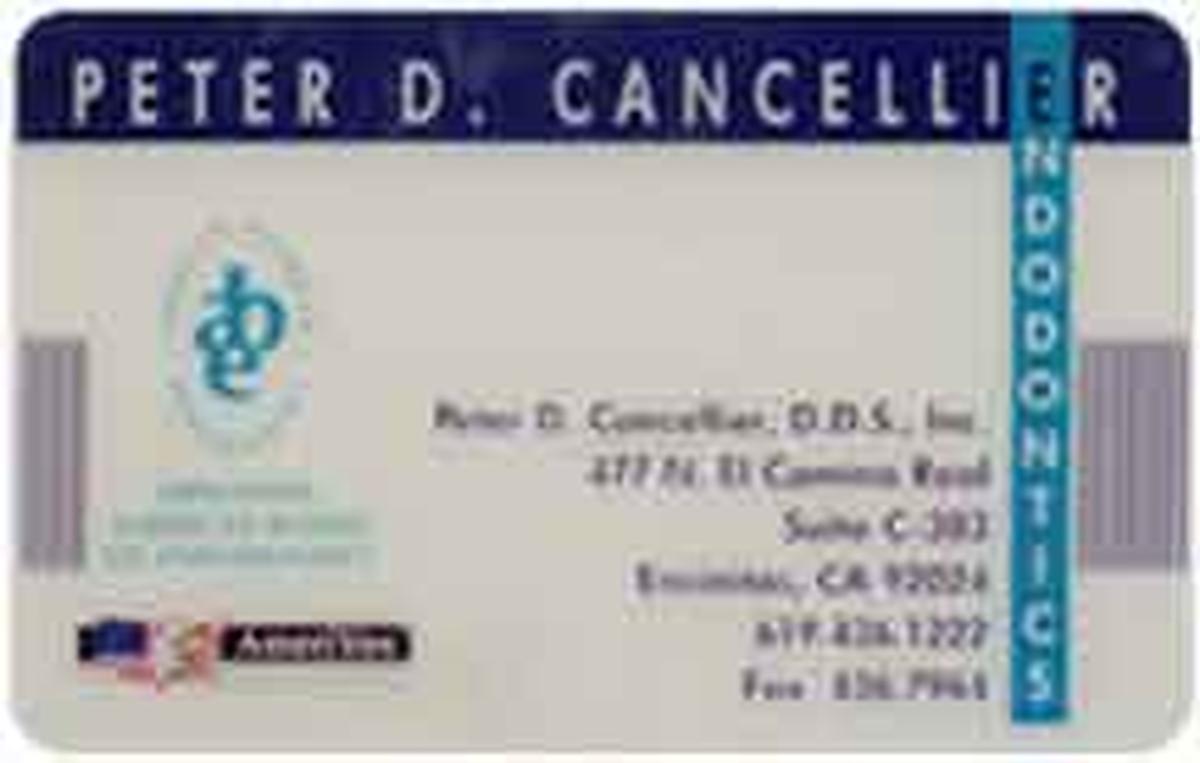 This collectible business card features the professional information for Peter D. Cancellier, D.D.S., a specialist in Endodonics based in Encinitas, California. The card prominently displays the logos of the American Board of Endodontics and the ABE Logo PROOF, underscoring Dr. Cancellier’s credentials and affiliations within the dental field. The design includes clear branding elements connected to dentistry and endodontic practice.