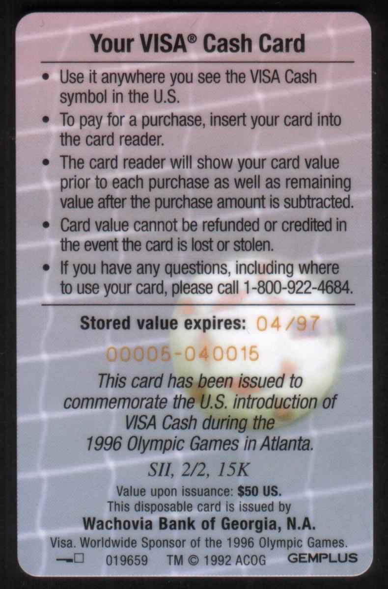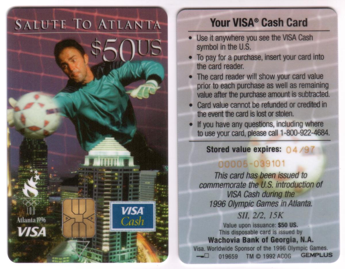 This collectible card celebrates the Olympic soccer competition held in Atlanta in 1996, focusing on the sport of soccer with a dynamic athlete image and connecting it to the official Olympic branding with a stored value component from Visa.