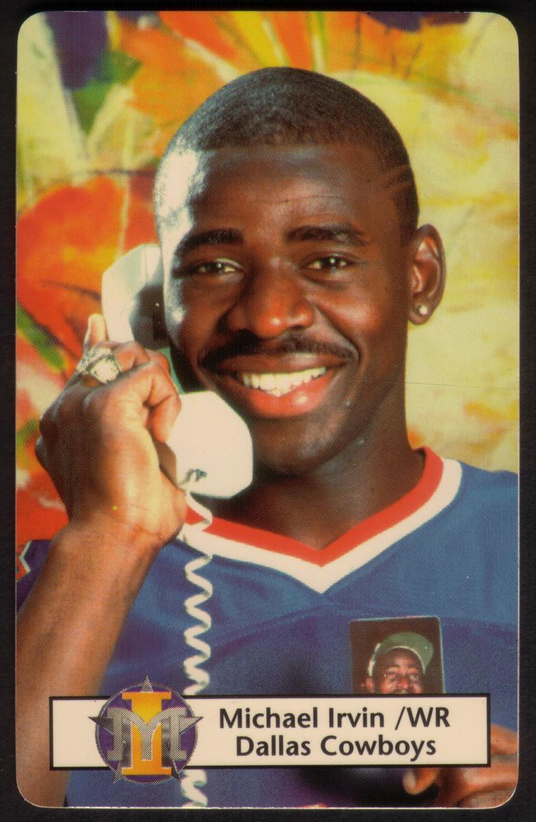 This collectible phone card features Michael Irvin, wide receiver for the Dallas Cowboys, prominently displayed in his Cowboys uniform. The image captures Irvin in action, wearing his white jersey and helmet, positioned mid-move on the football field. The background includes blurred stadium bleachers filled with spectators, emphasizing the live-game setting.