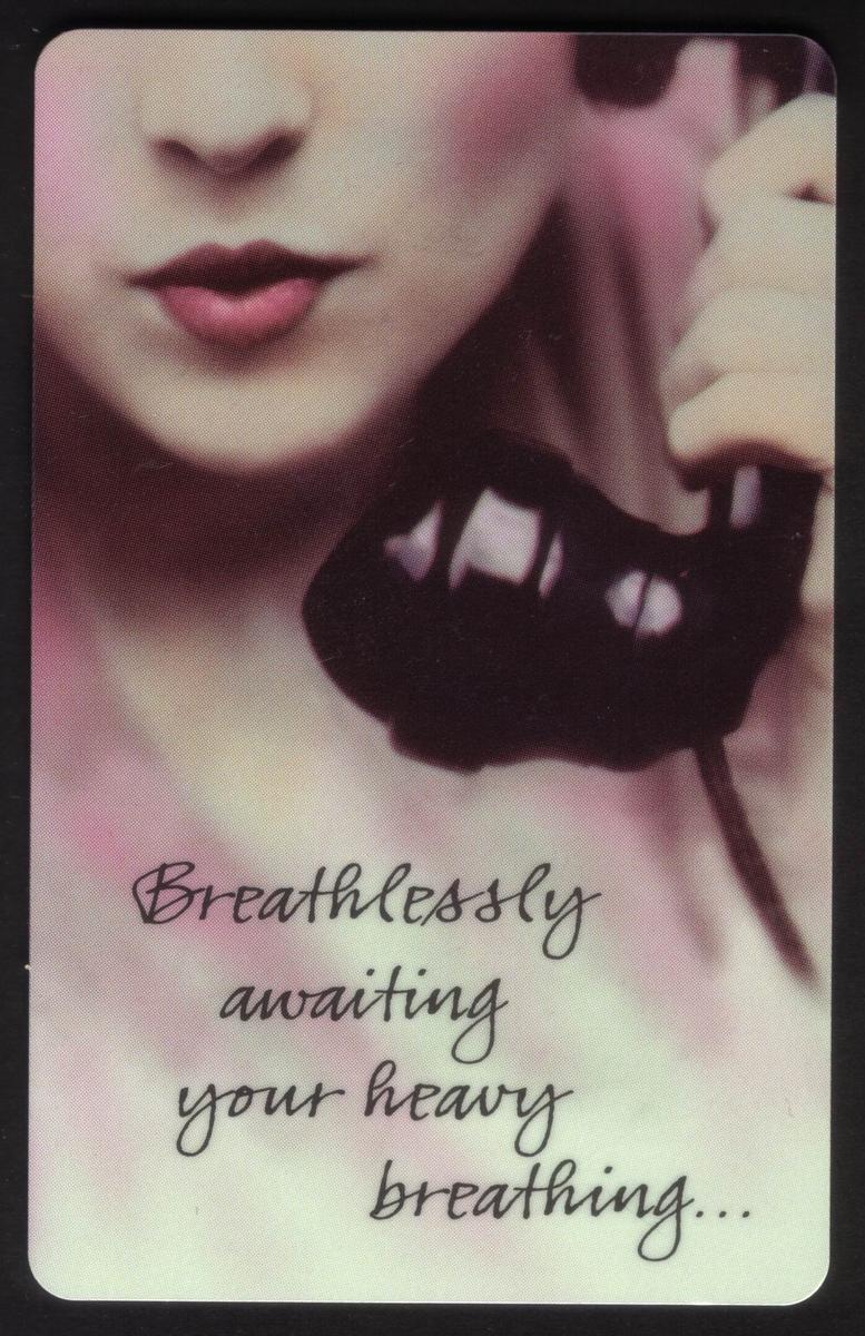 On the top right corner of the card, the text “Breathlessly Awaiting Your Heavy Breathing” is displayed in a bold font, emphasizing the card’s theme. Just below it, the designation “#600TEL 103-9” appears, referencing the card’s series identification. The bottom right corner carries the Hallmark and Sprint trademarks, linking the card to both companies. These details confirm its official production as a collectible phone card.