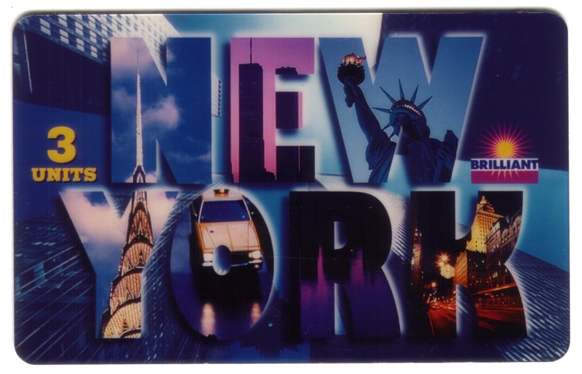 Vibrant New York City-themed phone card featuring iconic landmarks like the Statue of Liberty, Chrysler Building, and cityscapes, with bold lettering and colorful city imagery. |