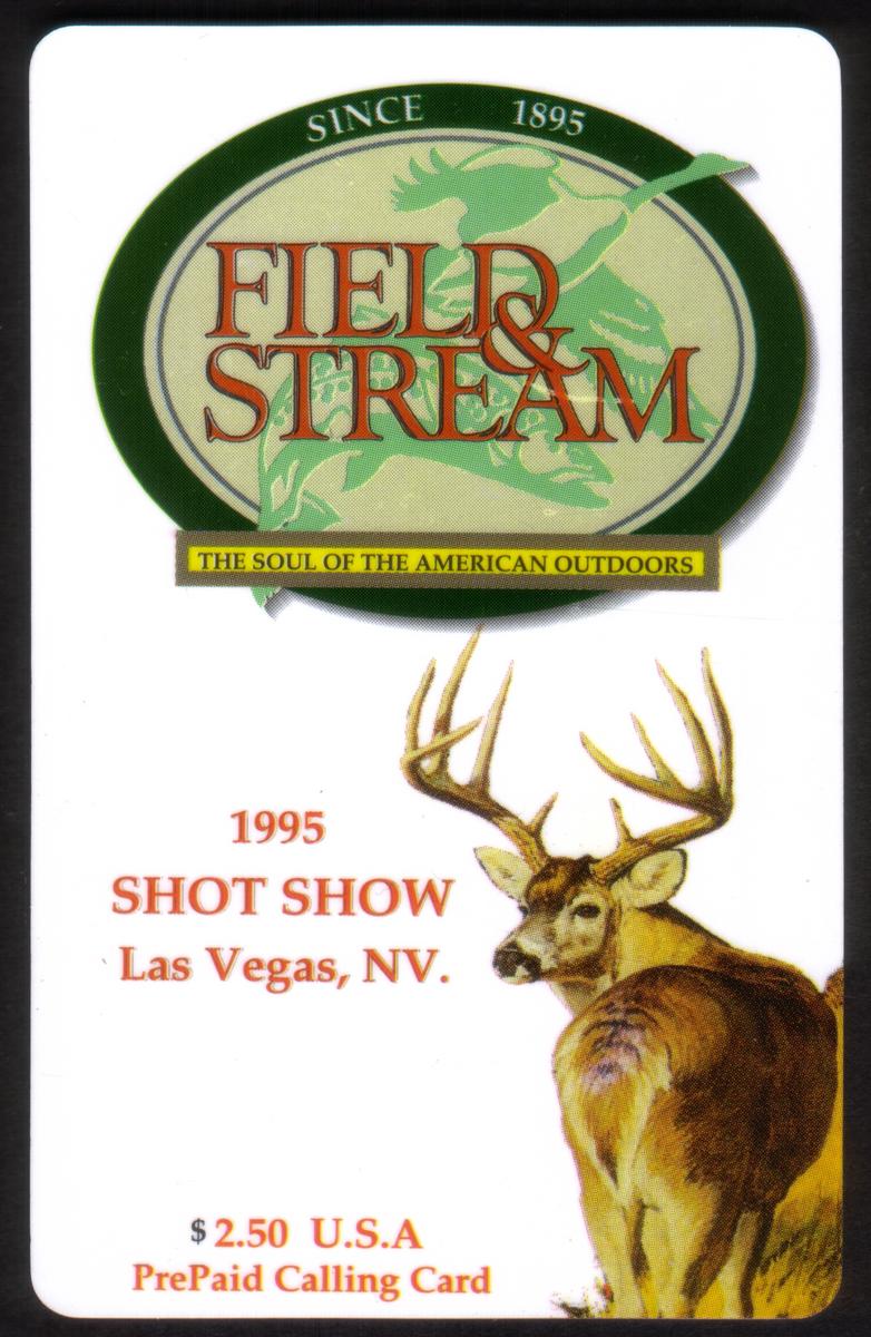 The card features text identifying the event "1995 Shot Show Las Vegas, NV," connecting it to an outdoor and hunting exhibition held in Las Vegas. The title "Field & Stream" appears prominently, along with a price of $2.50, referencing the well-known magazine focused on hunting, fishing, and outdoor activities. These details underline the card's collectible aspect related to hunting culture.