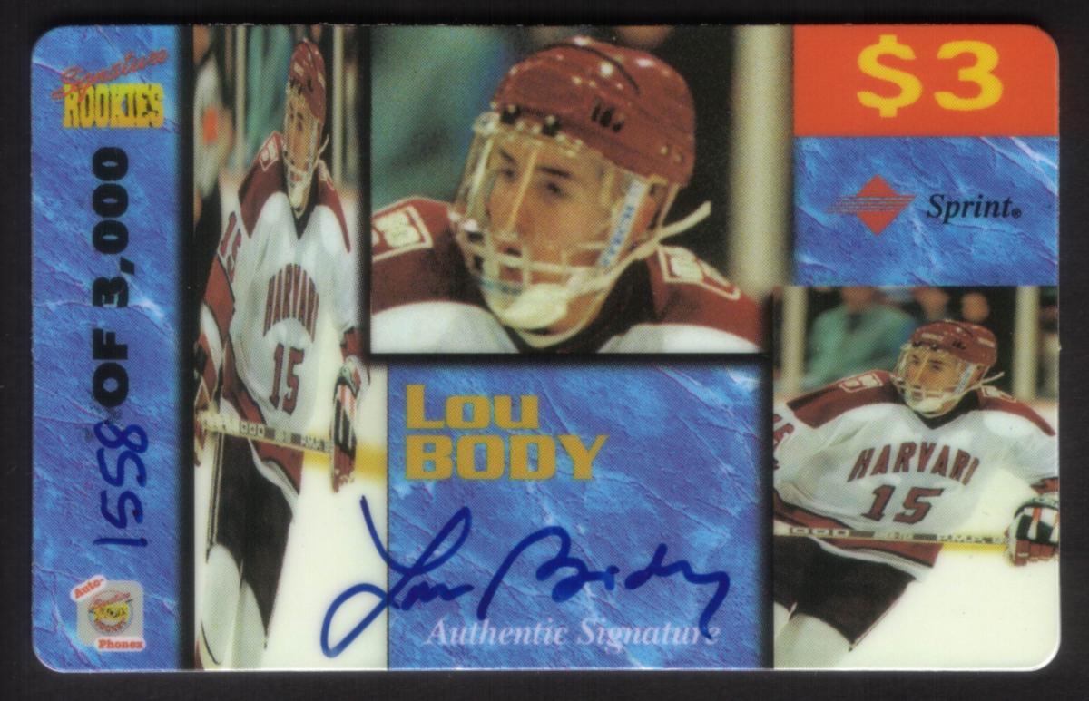 The card is made specifically for hockey sports collectors and highlights the player Lou Body as a rookie with an authentic autograph valued at $3. The card is collectible within the realm of ice hockey memorabilia, combining both the player’s image and a verified signature to enhance its appeal and authenticity.