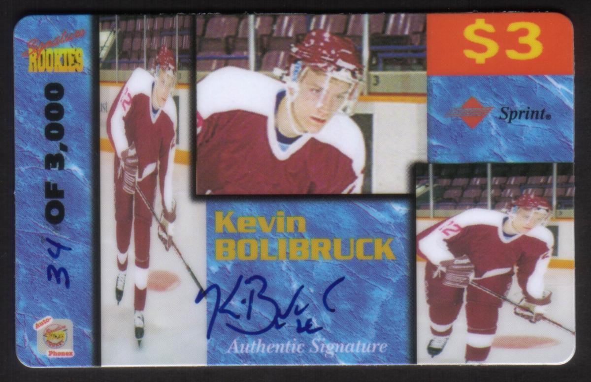 This collectible ice hockey card features Kevin Bolibruck, a professional hockey player. The card is part of the Auto-Phonex Signature Rookies series and displays an authentic signature of Kevin Bolibruck, clearly visible on the card. The signature is valued at $3, signifying the card's status as an autographed rookie card.