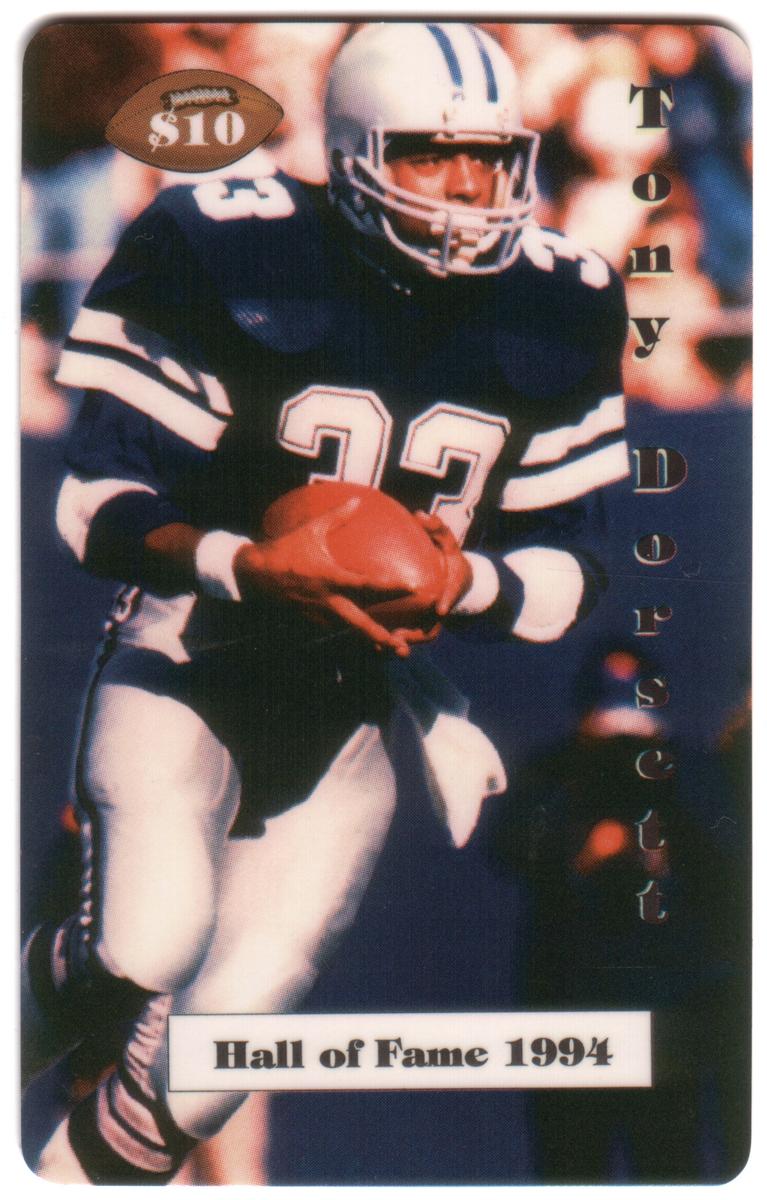 This collectible card features a color photographic image of Tony Dorsett, a Pro Football Hall of Fame running back. He is depicted in action wearing the Dallas Cowboys uniform. The card highlights his significance in the National Football League (NFL) and his legacy as a football player.
