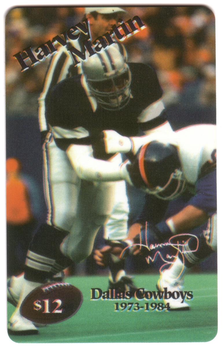 This collectible card features Harvey Martin, a former professional football player for the Dallas Cowboys who played from 1973 to 1984. The image shows Martin in his full Dallas Cowboys uniform, including his helmet and pads, ready for action on the football field. The NFL (National Football League) and Football logos are present, identifying the sport and league associated with this card. The card prominently includes the name "Harvey Martin" along with his team affiliation, "Dallas Cowboys," and his playing years, 1973-1984.