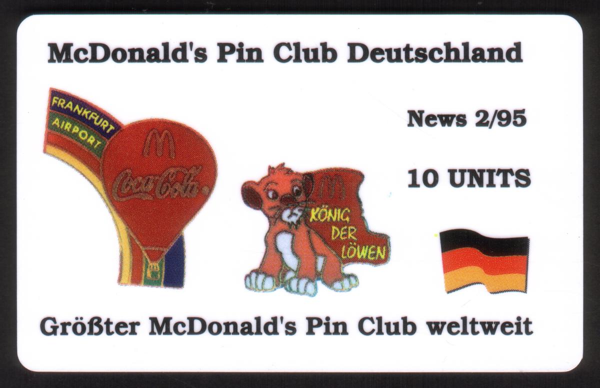 The cards include McDonald's branding represented by the iconic Golden Arches logo and are associated with the McDonald's Pin Club in Germany. The design elements also incorporate the colors and style commonly used in McDonald's promotional materials. Text on the cards clearly identifies the McDonald's brand and Coca-Cola collaboration, making them a unique collectible for fans of fast food, beverage marketing, and phone card memorabilia.